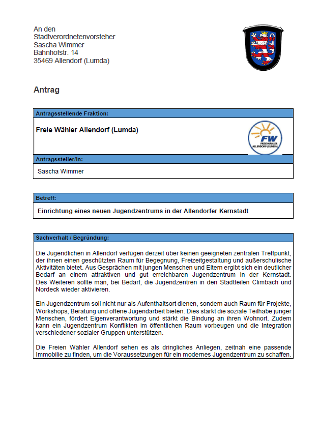 Hier finden Sie von den freien Wählern gestellte Anträge und sonstige Dokumente über unser Tun.